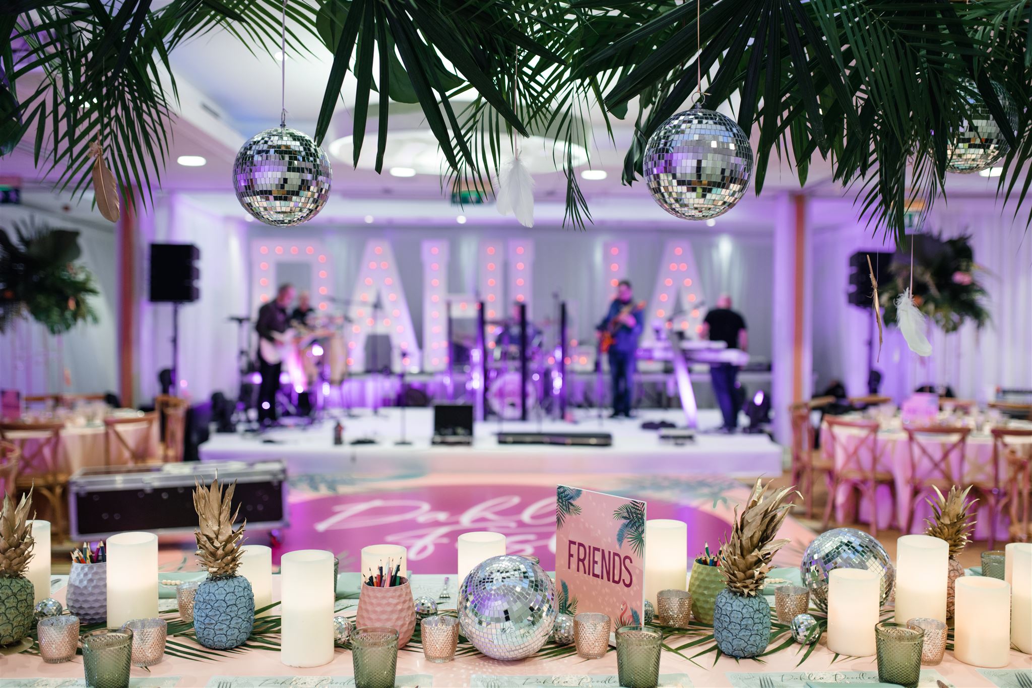 Pulling out all the stops to create a ‘Dahlia Fest’ tropical disco theme, we made sure the event was dressed to impress with perfectly coordinated decor – from the grand entrance to the main function suite – as well as fabulous personalised lighting.