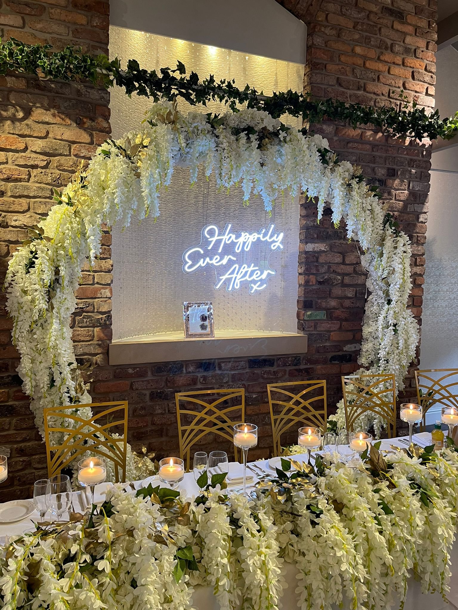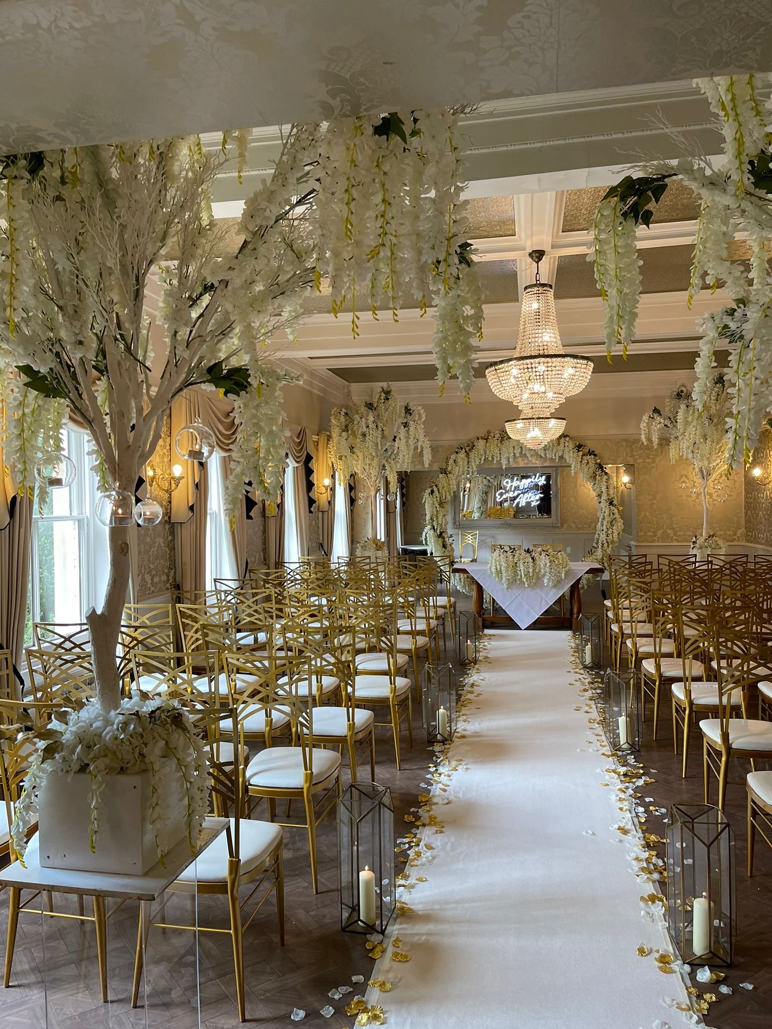 Centred around a luxe colour scheme, we created the couple’s desired look using an abundance of trailing white blooms, gold foliage and magical wisteria trees accompanied by romantic candlelight and metallic flourishes.