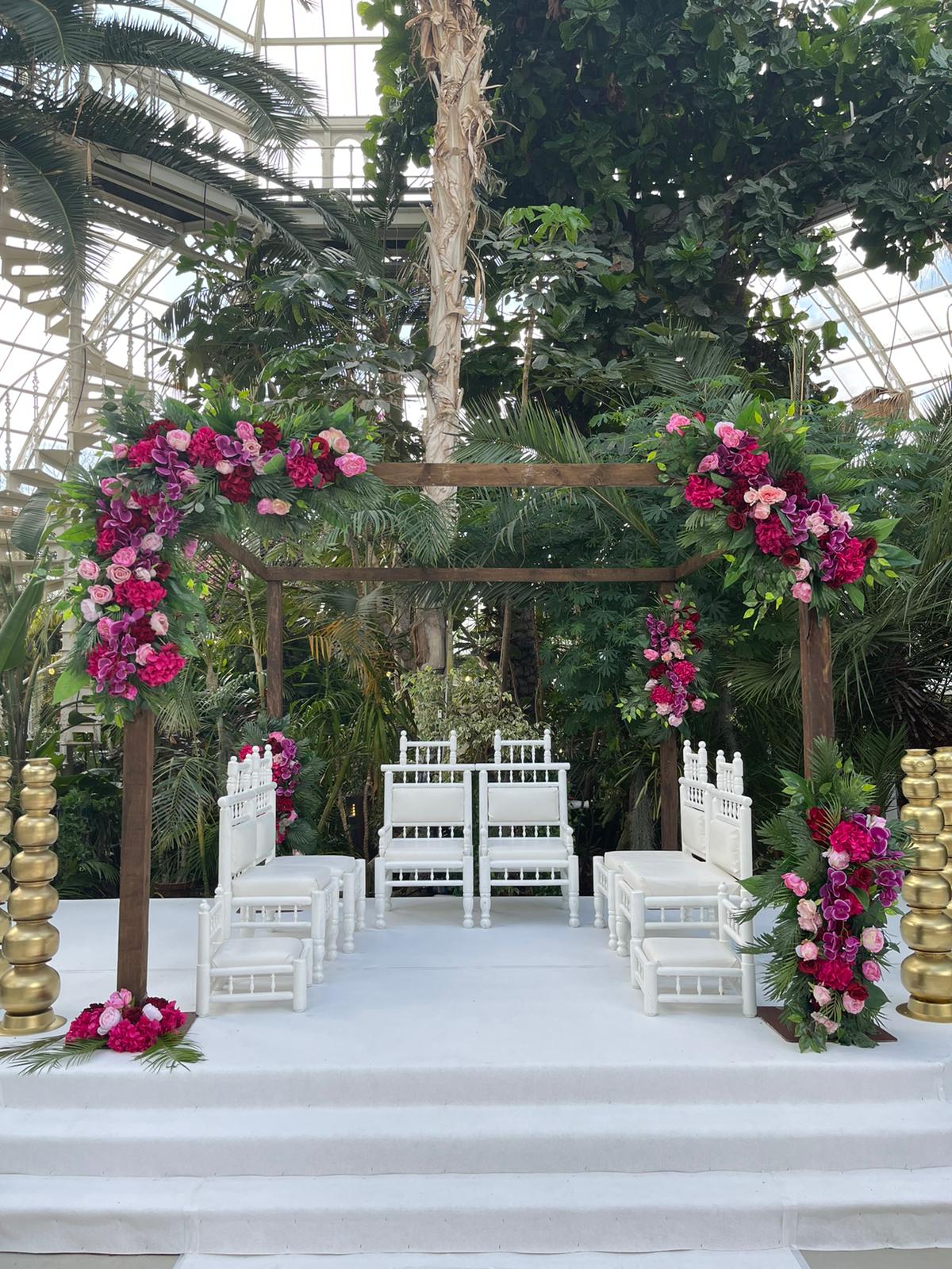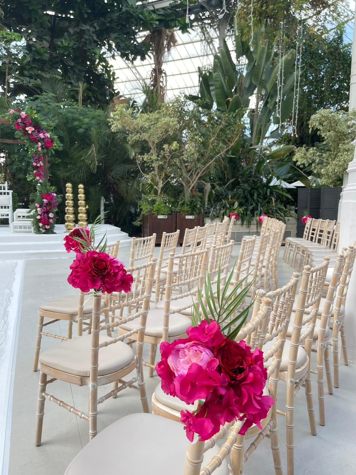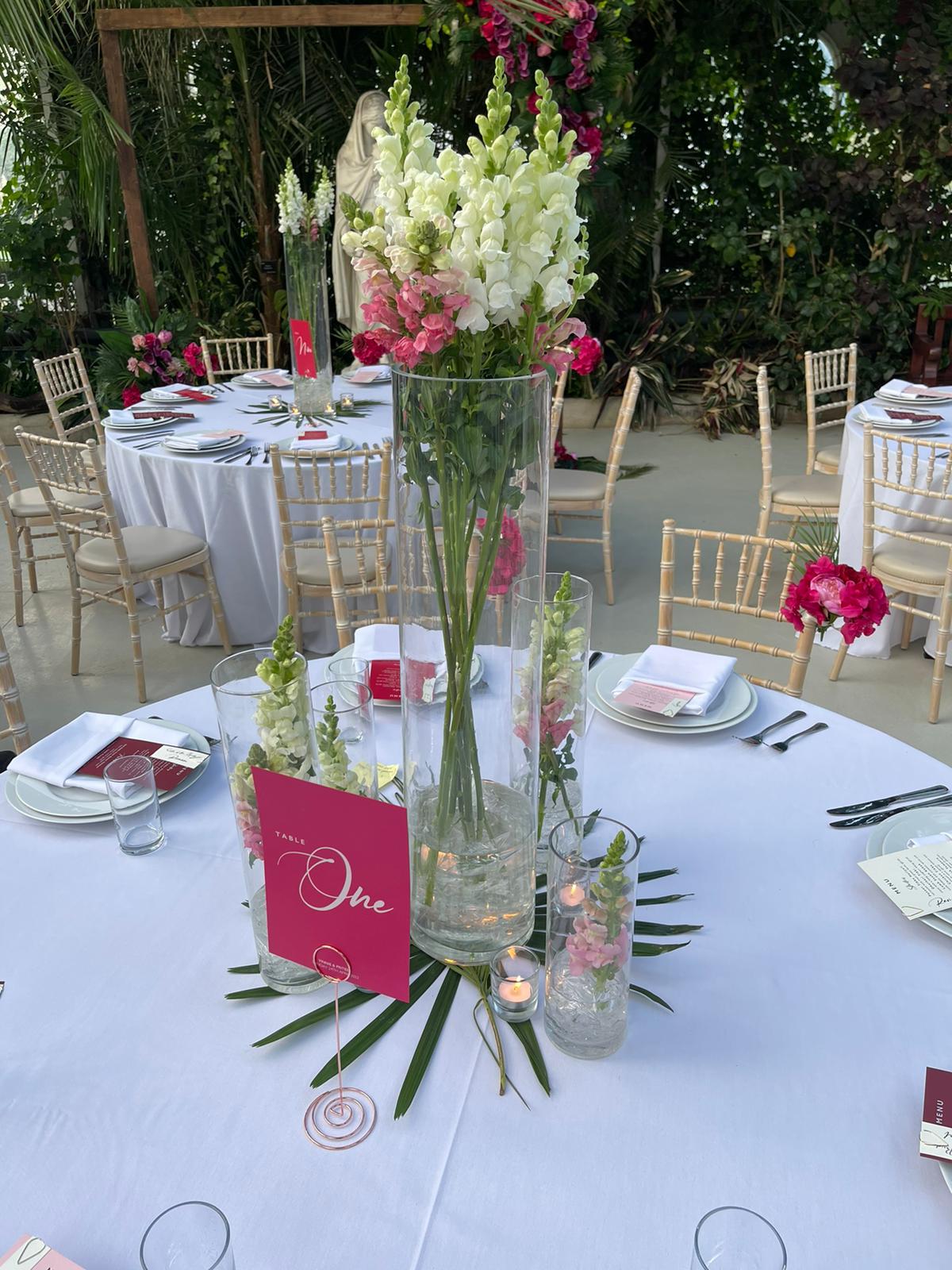 We dressed the spectacular setting with a fitting floral-focused theme, which popped beautifully against the botanical backdrop of the venue.