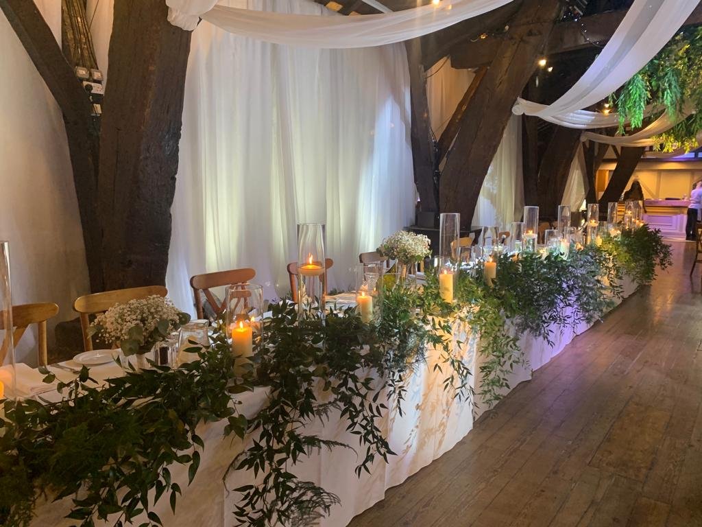 For the reception, circular guest tables were styled with coordinating candle and foliage centrepieces, while the top table had a full-length, trailing foliage runner interspersed with clear cylinder vases and candles.